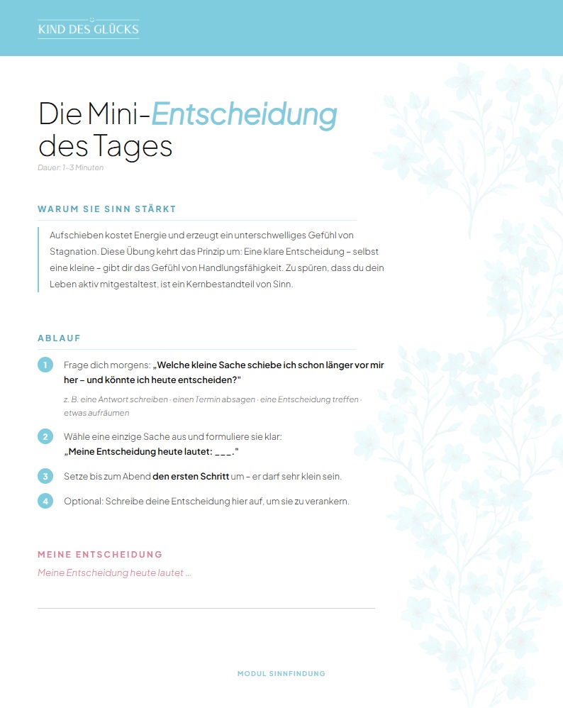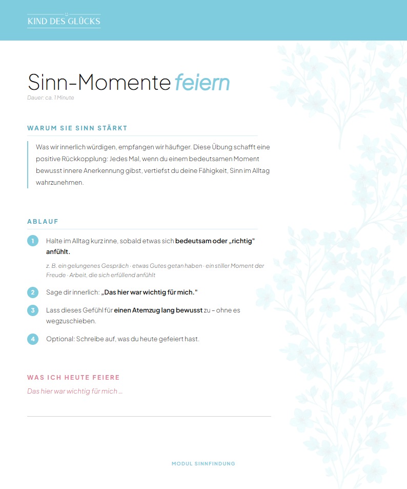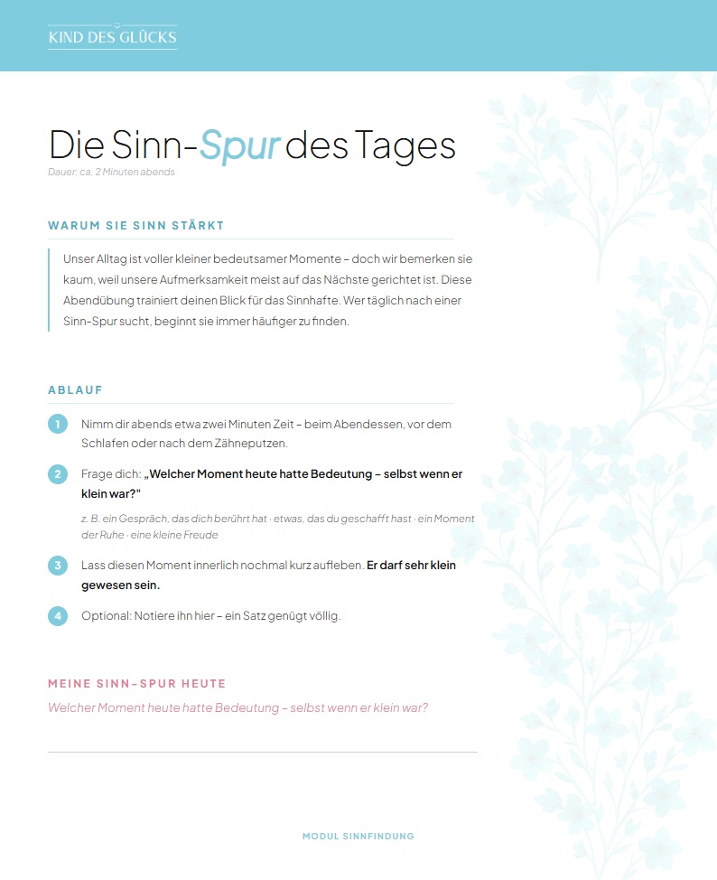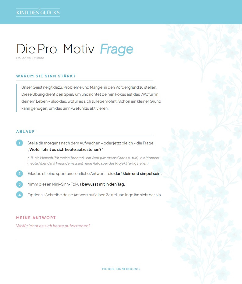 Unser Geist neigt dazu, Probleme und Mangel in den Vordergrund zu stellen. Diese Übung dreht den Spieß um und richtet deinen Fokus auf das „Wofür" in deinem Leben – also das, wofür es sich zu leben lohnt. Schon ein kleiner Grund kann genügen, um Sinn-Gefühl zu aktivieren.